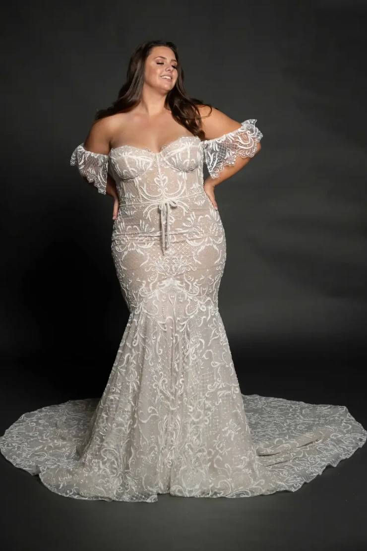 Above Photo Credit: Berta Plus feminine lace fitted mermaid style wedding gown with corset bodice and off the shoulder sleeve