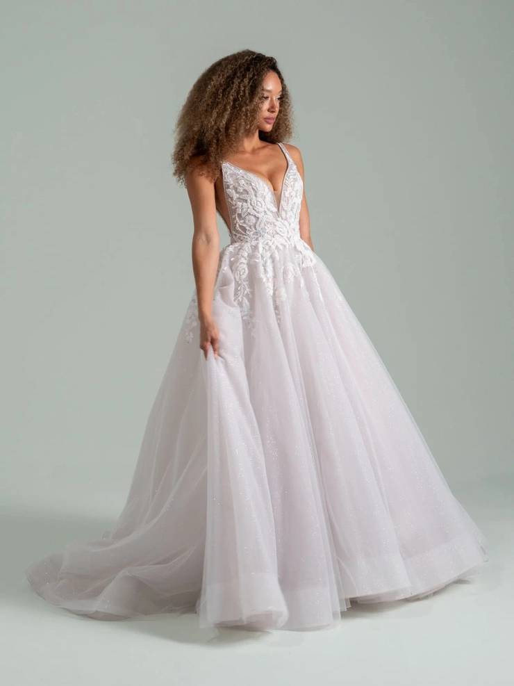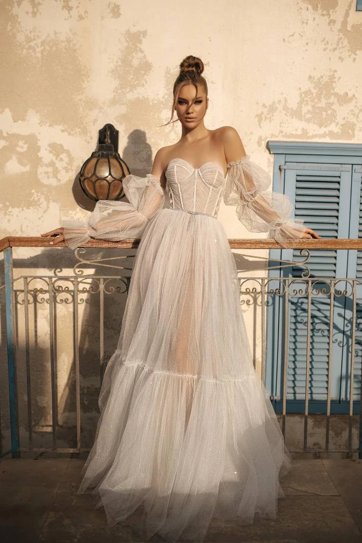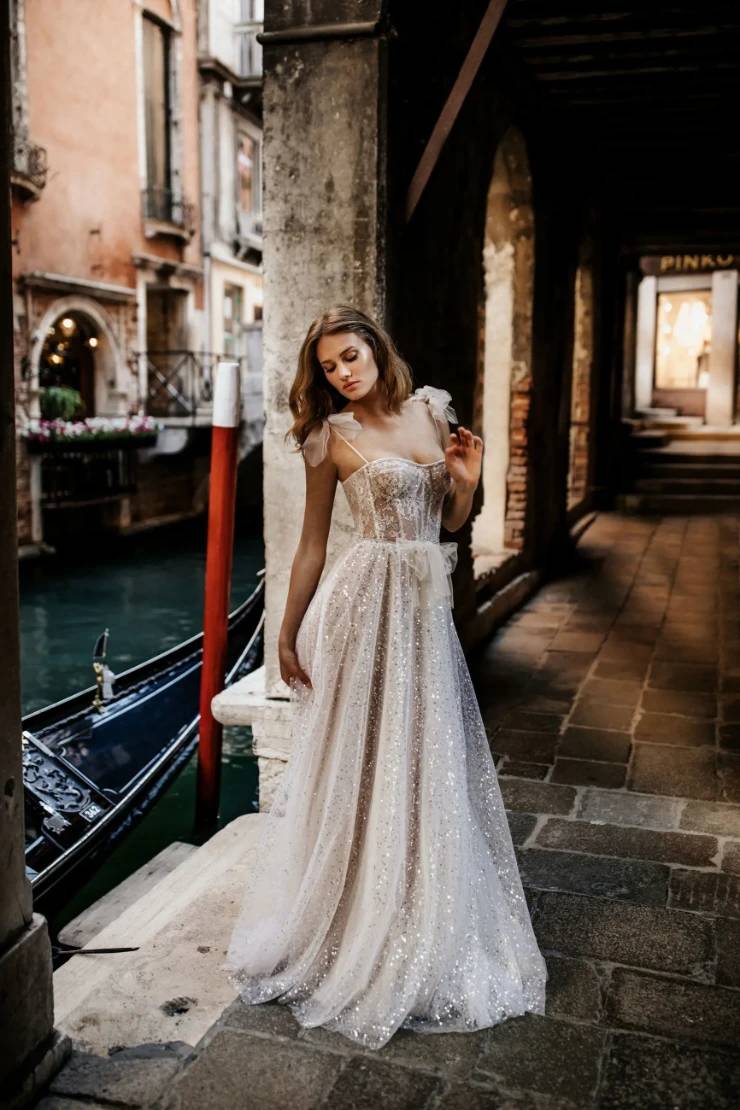 Above Photo Credit: Jolie Bridal delicate wedding dress with sequin tulle, corset bodice and bow straps