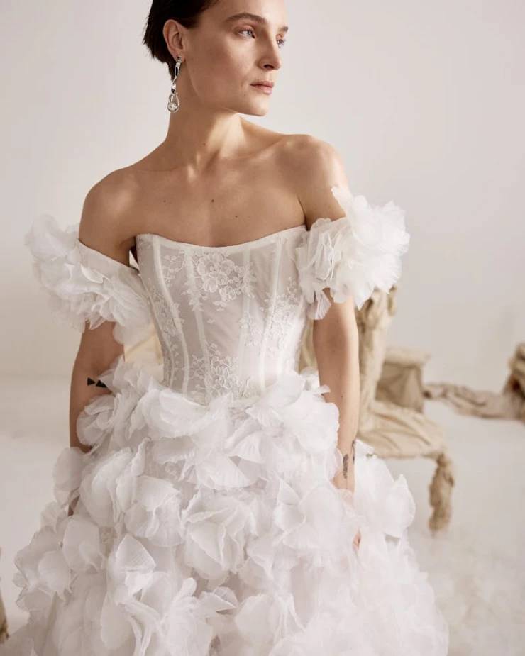 Above Photo Credit: Rivini by Rita Vinieris feminine wedding dress with corset bodice with ruffle floral tulle skirt and cap sleeves