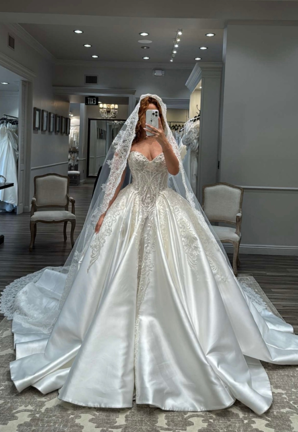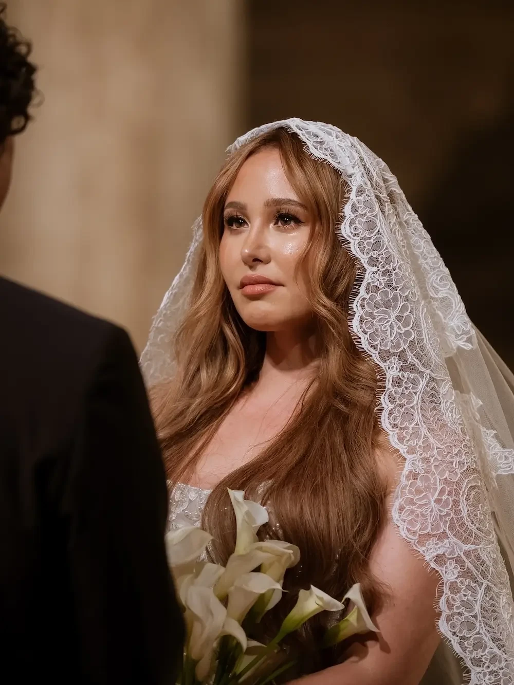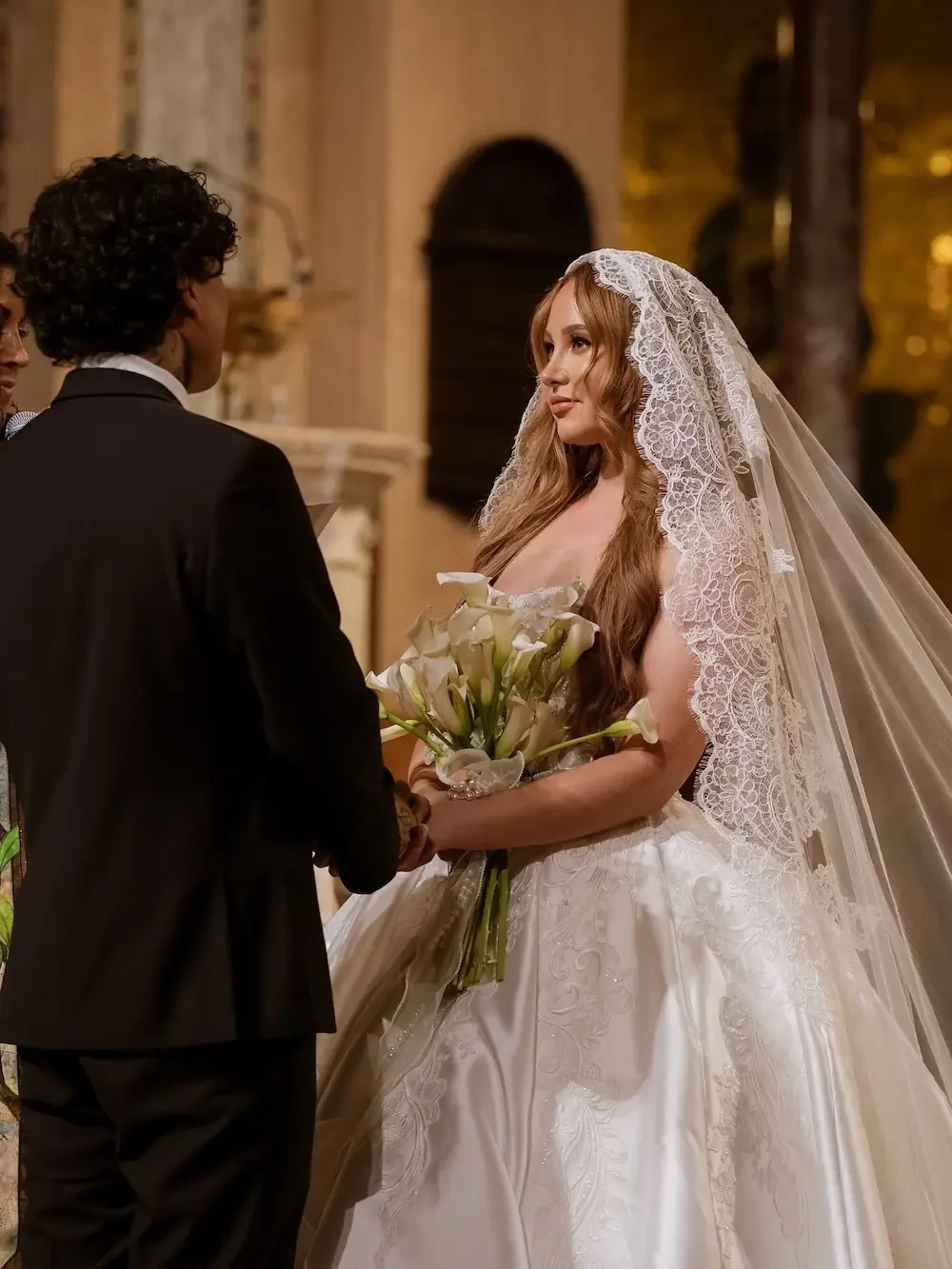 To complete her bridal look, Catherine paired her custom ballgown with a breathtaking Zuhair Murad Mantilla style veil, also from Lovella Bridal. The veil featured lace edging all around and a delicate layer of soft tulle that cascaded behind her. Its cathedral length and romantic details were the perfect finishing touch, complementing the sparkle and grandeur of her Leah Da Gloria gown while adding a layer of Hollywood-worthy drama.