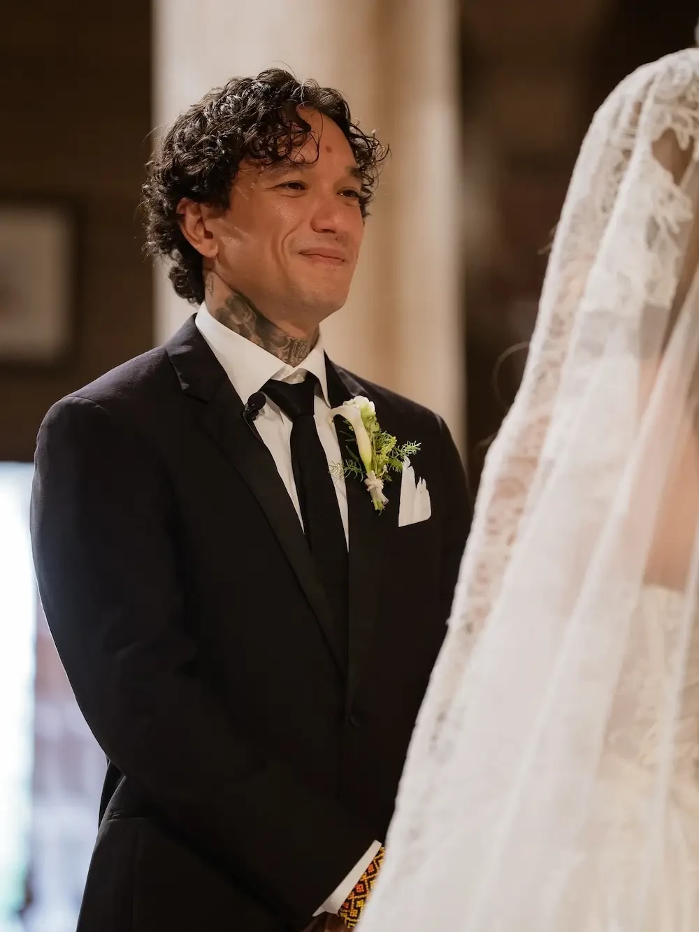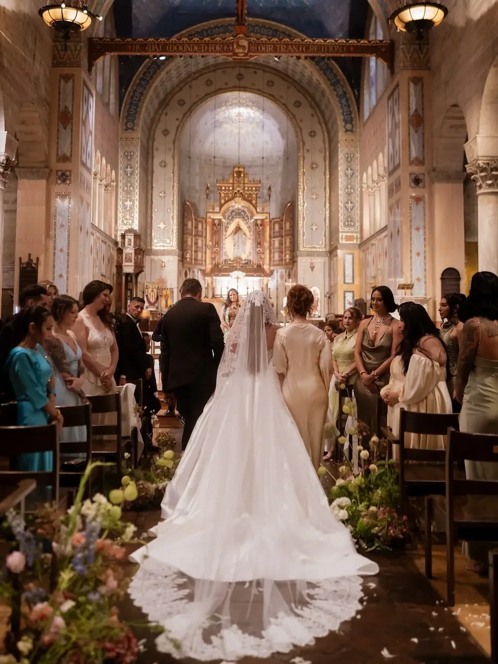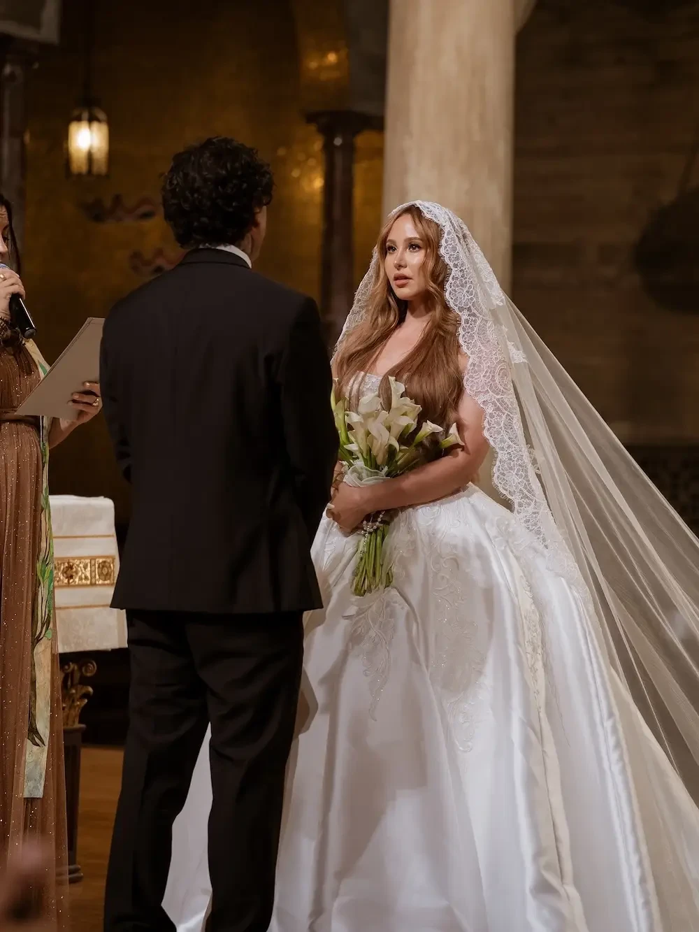 To complete her bridal look, Catherine paired her custom ballgown with a breathtaking Zuhair Murad Mantilla style veil, also from Lovella Bridal. The veil featured lace edging all around and a delicate layer of soft tulle that cascaded behind her. Its cathedral length and romantic details were the perfect finishing touch, complementing the sparkle and grandeur of her Leah Da Gloria gown while adding a layer of Hollywood-worthy drama.