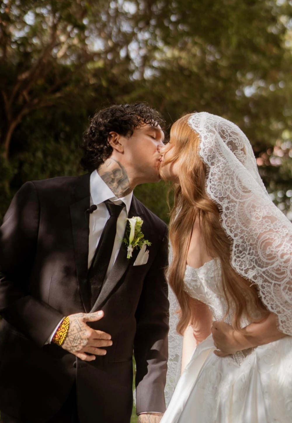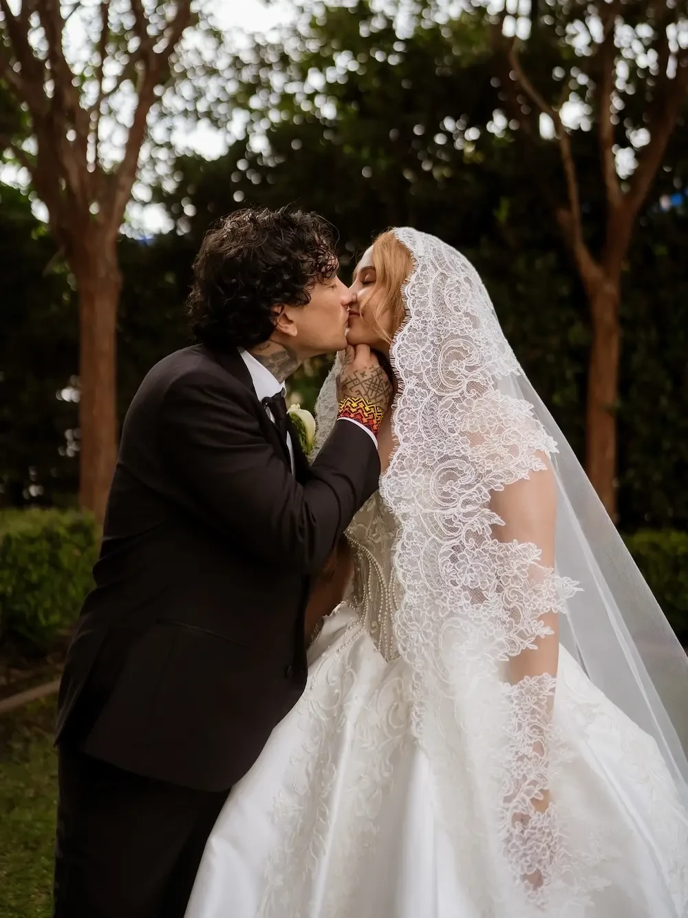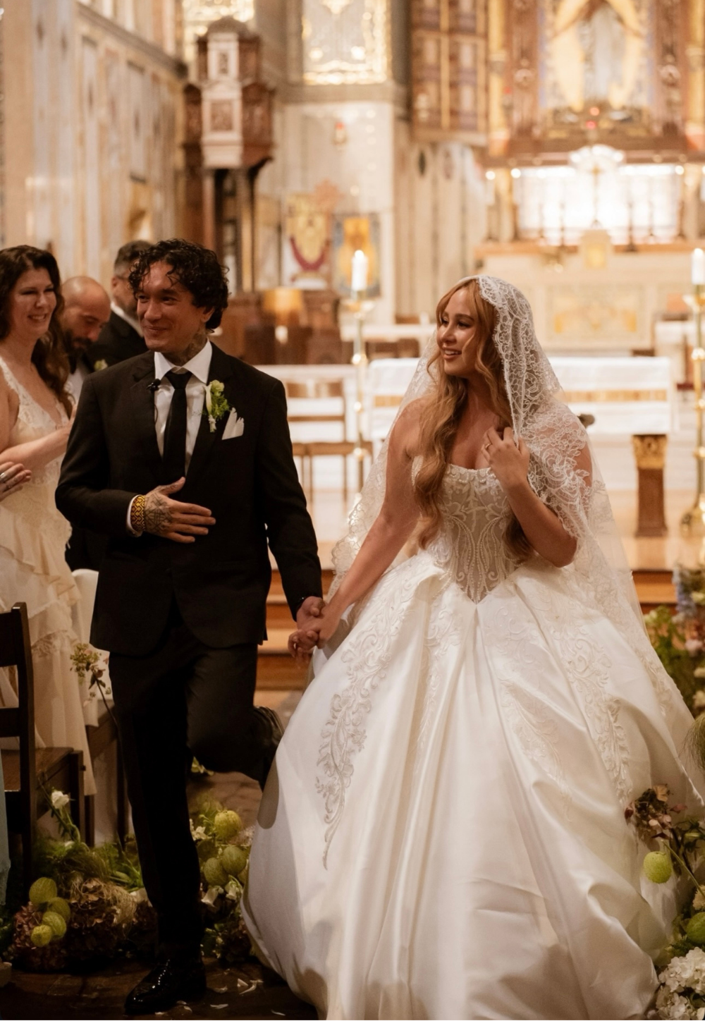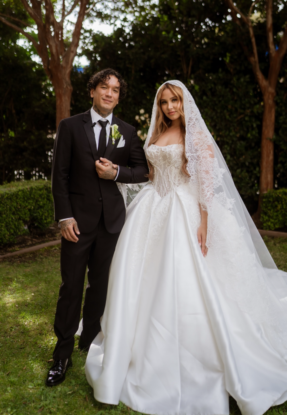 If you are a bride-to-be searching for a glamorous wedding dress with regal details and unforgettable sparkle, you are in the right place. Today we are so excited to be sharing a real wedding inspiration and bridal style featuring celebrity and influencer bride Catherine Paiz, one of our real Lovella Brides. Catherine wore a custom, one-of-a-kind Leah Da Gloria ballgown with a crystal-embellished corset bodice and dramatic train, paired with a stunning Zuhair Murad Mantilla veil all from Lovella Bridal in Los Angels, CA.