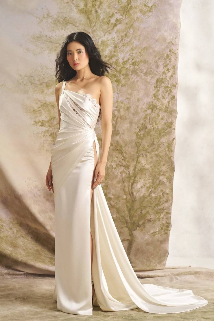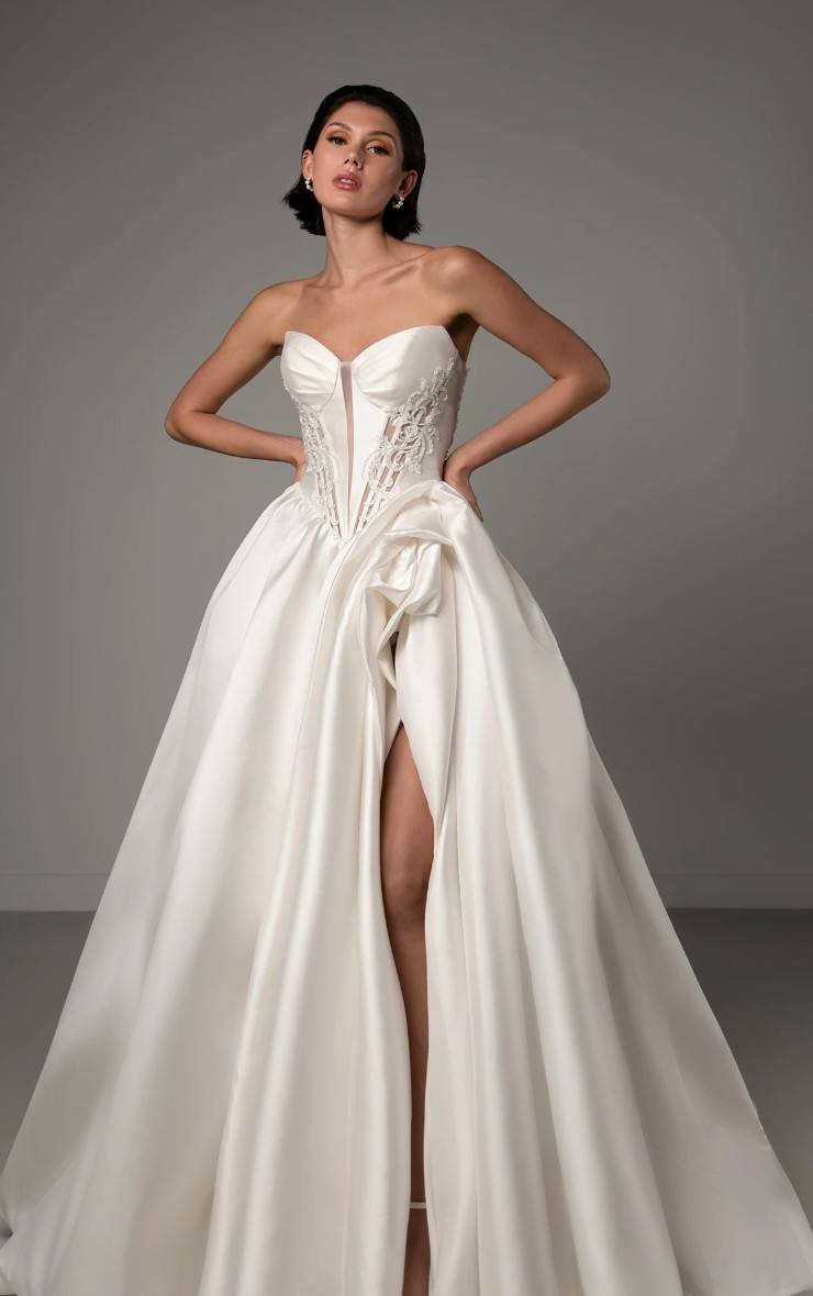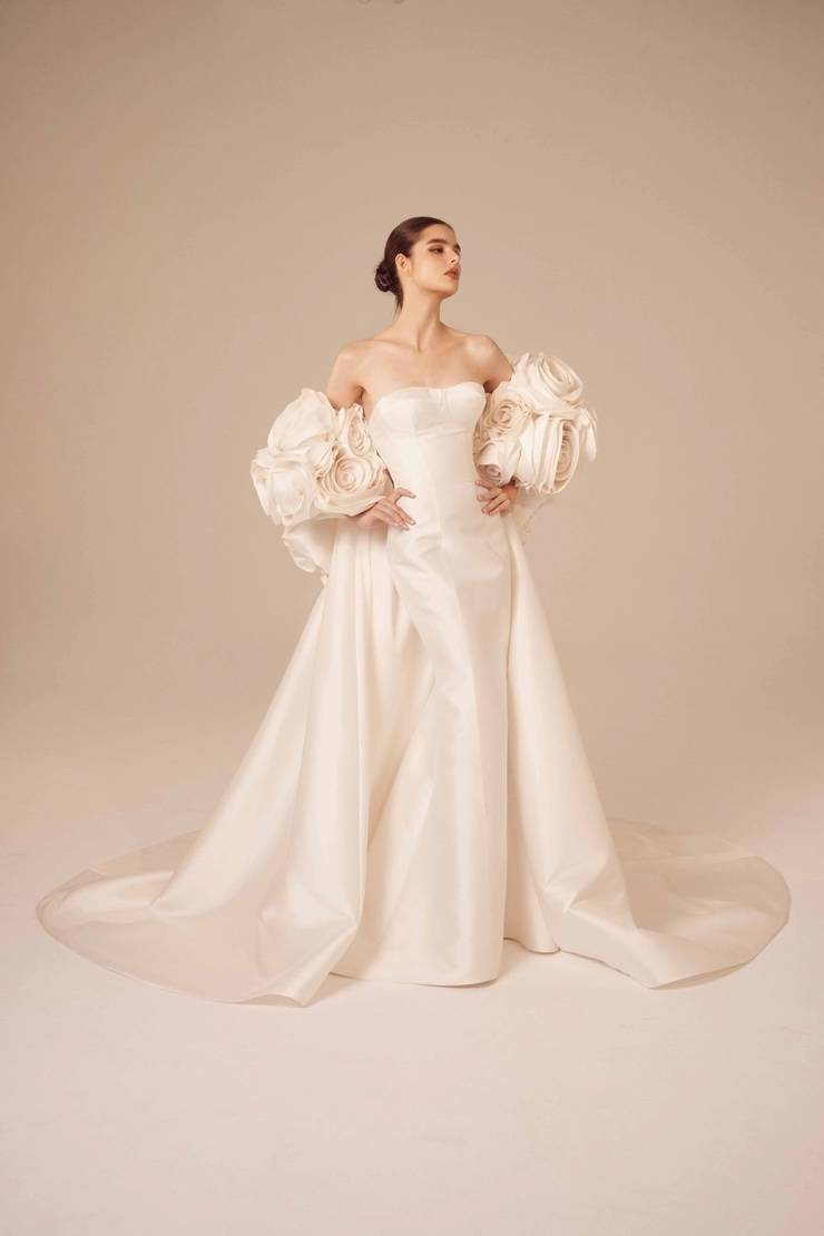 You’ll often see sculpted bodices, architectural draping, dramatic skirts, and unexpected proportions that create a striking visual impact. Details like 3D appliqués, intricate beadwork, bold necklines, and layered textures give these wedding dresses depth and personality. Every element is intentional.