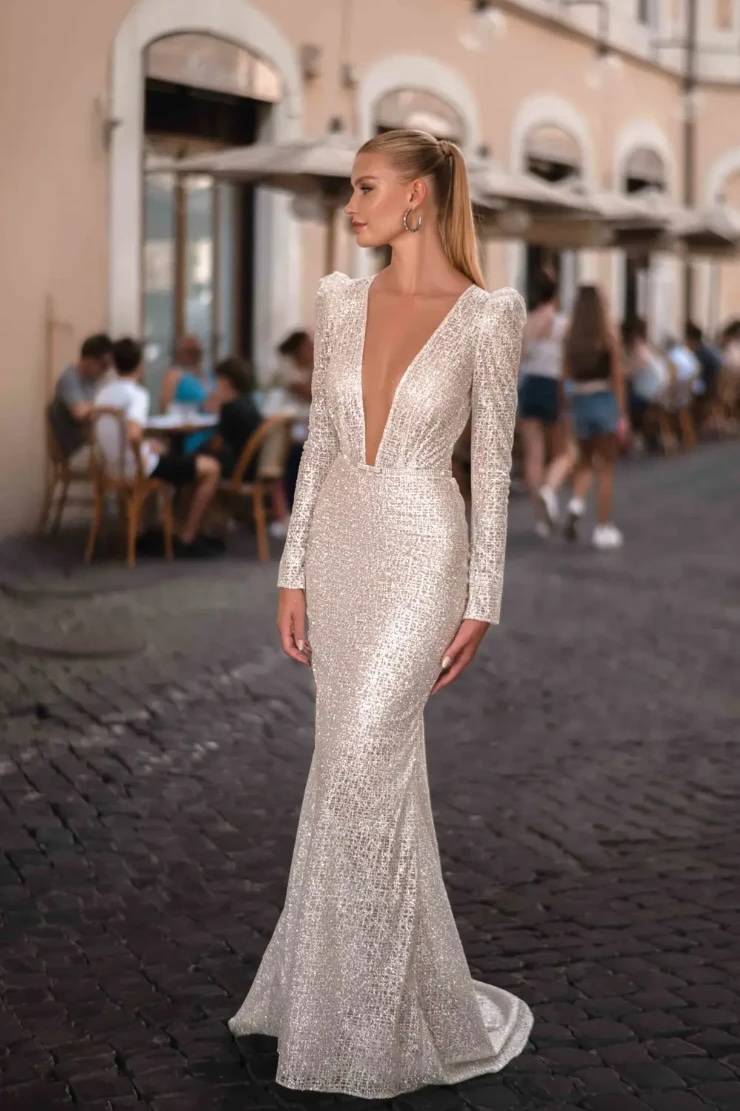 Above Dress: Jolie Bridal sparkle long sleeve couture wedding dress with deep V neckline