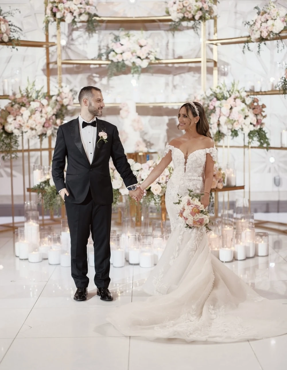 Lovella bride, Anika, found her dream wedding dress in a lace, fit to flare wedding dress by Martina Liana. This elegant bridal dress features an illusion plunging neckline and an illusion lace open back design. We love the floral lace detailing and floral appliques that add movement and texture to this bridal dress. Floral lace off the shoulders straps add a feminine touch while the long wedding dress train with lace detailing adds a bit of drama to the classic silhouette. Our bride completed her elegant wedding day style with an embellished bridal headpiece and a Cathedral length, simple wedding veil.