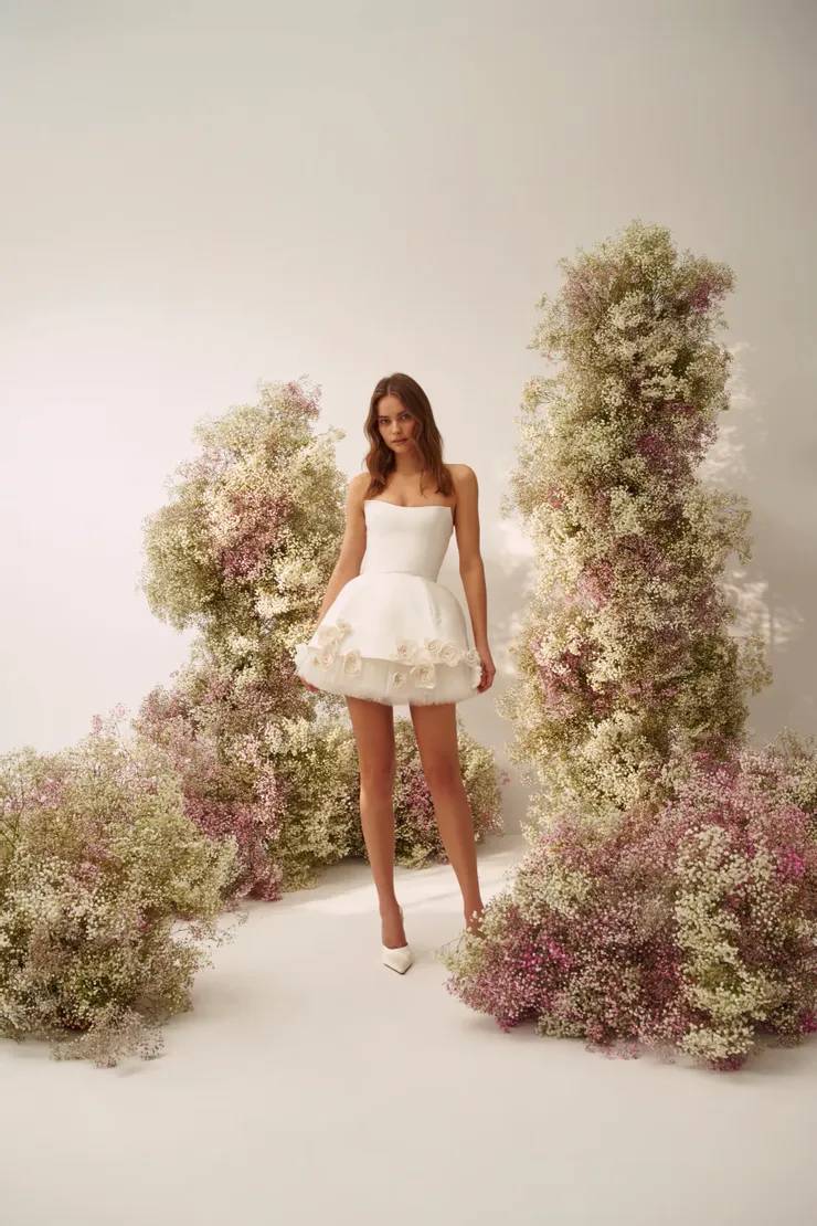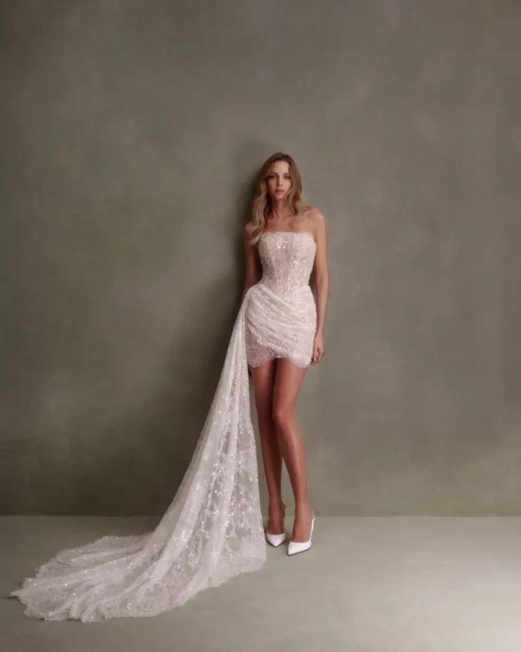 Brides who want a fun after party wedding dress or a modern, fashion-forward moment are loving these shorter silhouettes. Mini and short wedding dresses bring a playful energy and are perfect if you want a second look, love a flirty hemline, or want something easy to dance in all night without giving up any of the luxury.