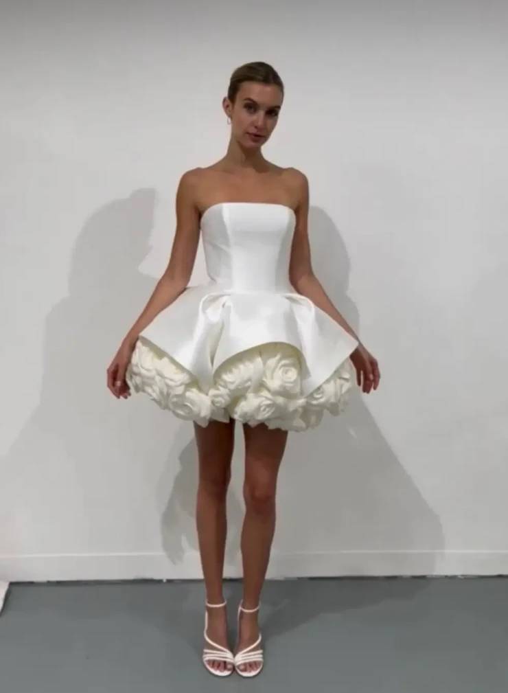 Shorter bridal dress silhouettes highlight the legs and create a modern, confident look that still feels chic and intentional. Fabrics like lace, satin, crepe, and embellished tulle offer structure, movement, and softness depending on your style. Brides can choose details such as pearl beading, oversized bows, corset bodices, draped necklines, floral appliqués, puff sleeves, or feather trims for a fashion-forward statement.