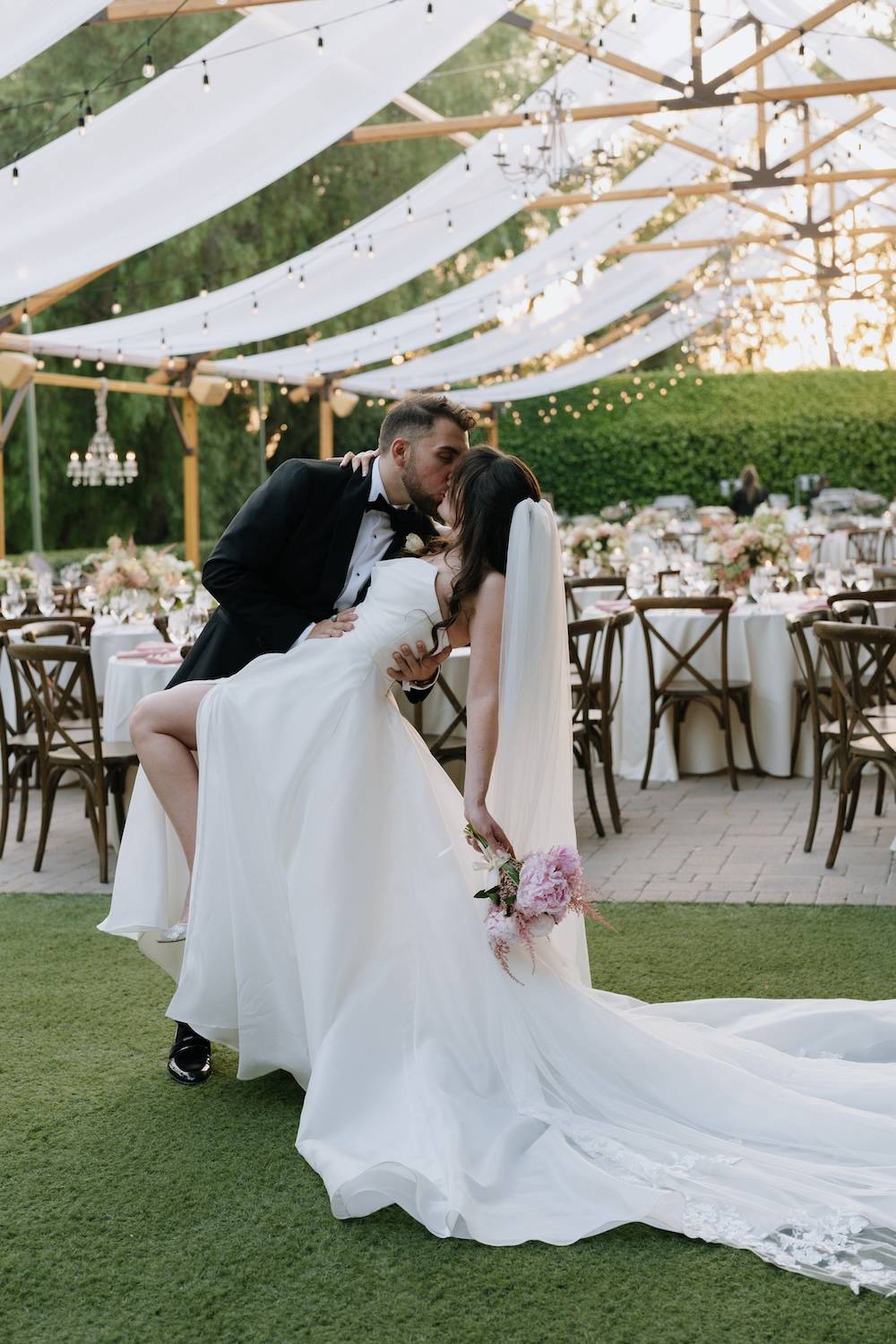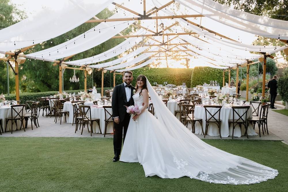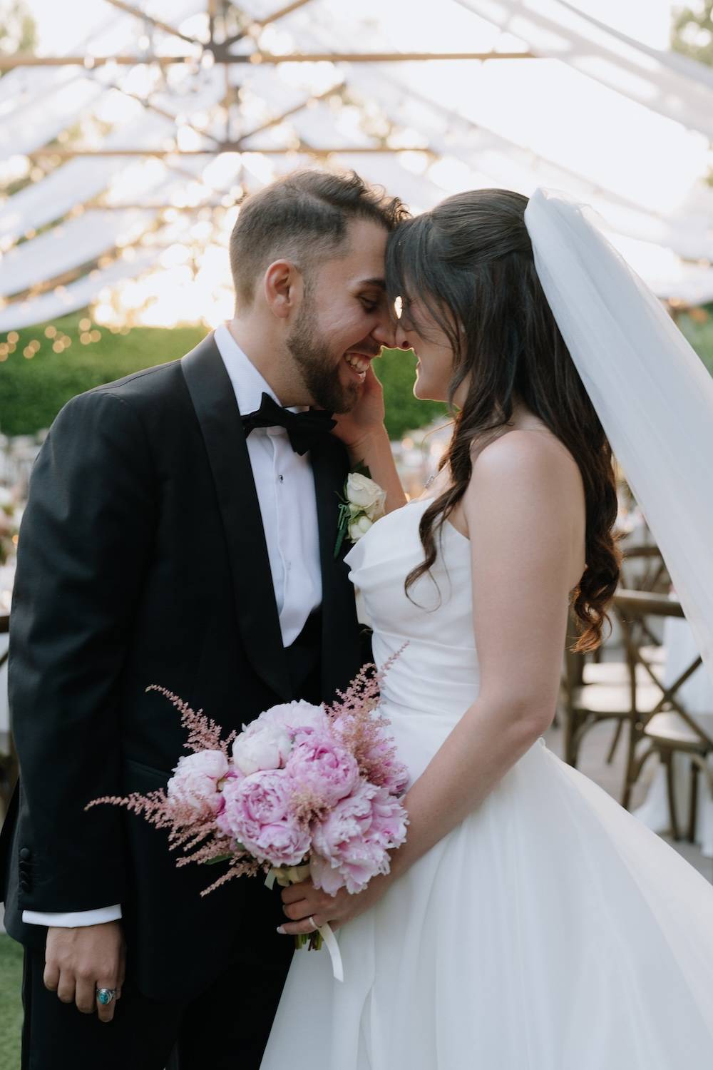 Our bride, Rachael, styled her wedding day look with a soft half-up, half-down hairstyle, allowing loose waves to flow naturally in the garden breeze. Her bridal bouquet, designed in delicate shades of lavender and blush, featured lush peonies, the perfect romantic touch. Their outdoor tented reception created a dreamy backdrop filled with natural beauty, elegance, and a touch of California sunshine.