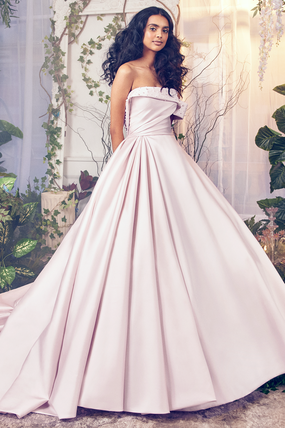 Above dress: strapless blush wedding dress with a-symmetrical design