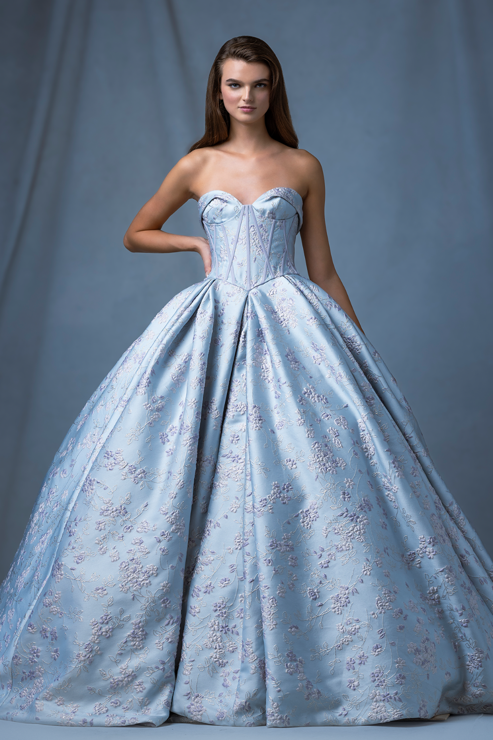 Above dress: brilliant ice blue ball gown with floral detail