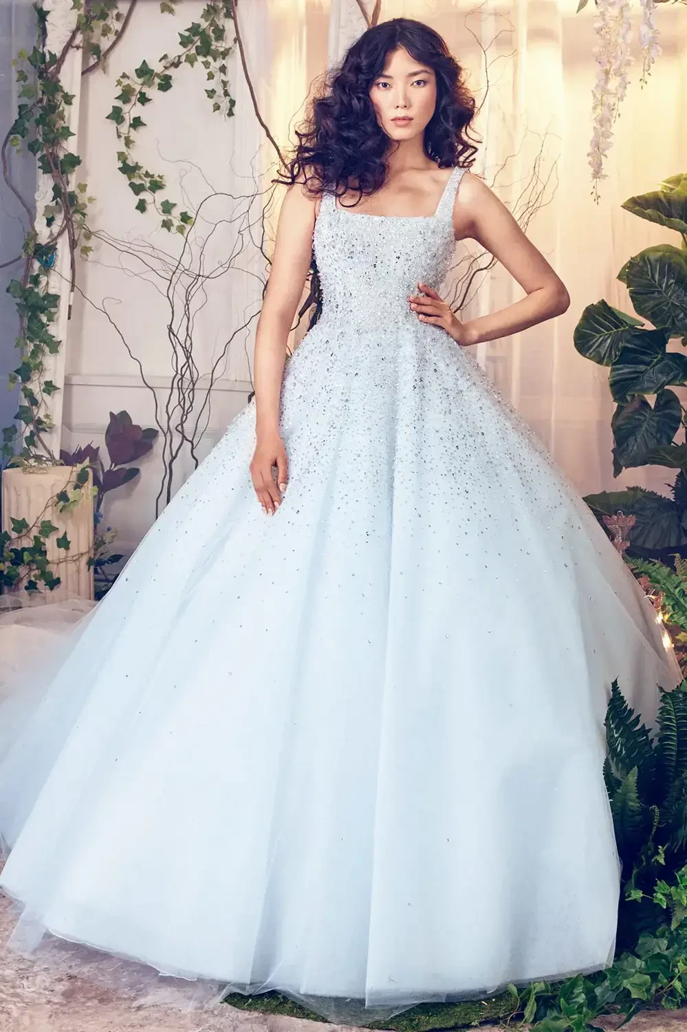 Above dress: soft ice blue ball gown with crystal embellishment