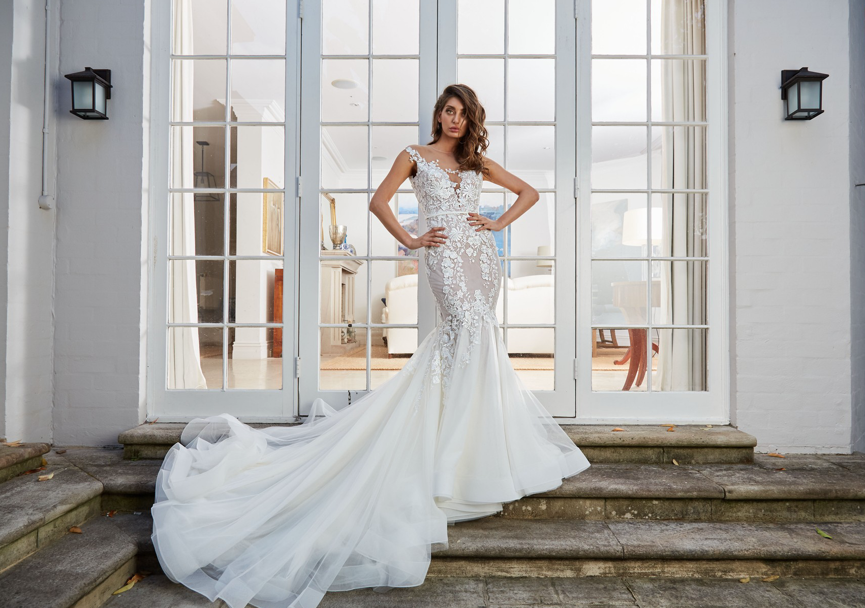 The Leah De Gloria Odessa gown from the Boheme 2018 collection is a breathtaking mermaid silhouette wedding dress that exudes modern romance and sophisticated allure. Crafted with intricate lace appliques and delicate beading, this gown features a captivating V-neckline with an illusion overlay, offering a hint of allure while maintaining an elegant aesthetic. The fitted bodice flows into a dramatic flared skirt, creating a stunning hourglass figure and a grand entrance. Delicate cap sleeves complete the look, adding a touch of classic charm to this contemporary design. Perfect for the bride who desires a blend of timeless elegance and contemporary style, the Odessa gown promises an unforgettable bridal statement.