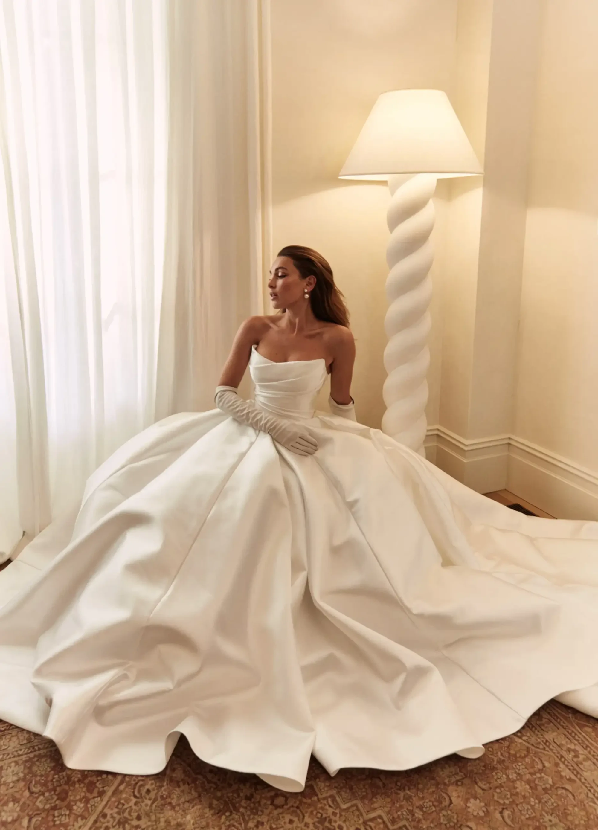 The Leah De Gloria Sasha bridal gown is a breathtaking masterpiece, embodying timeless elegance and modern romance. This exquisite ball gown features a voluminous skirt crafted from luxurious fabric, creating a dramatic and ethereal silhouette perfect for a grand entrance. The strapless sweetheart neckline beautifully accentuates the décolletage, offering a classic and sophisticated appeal. Paired with elegant long gloves, the Sasha gown exudes an air of refined grace and vintage charm. Designed for the bride who dreams of a fairytale wedding, this dress combines intricate detailing with a flattering fit, ensuring you feel radiant and unforgettable on your special day. Its opulent design and delicate craftsmanship make it a truly captivating choice for any discerning bride.