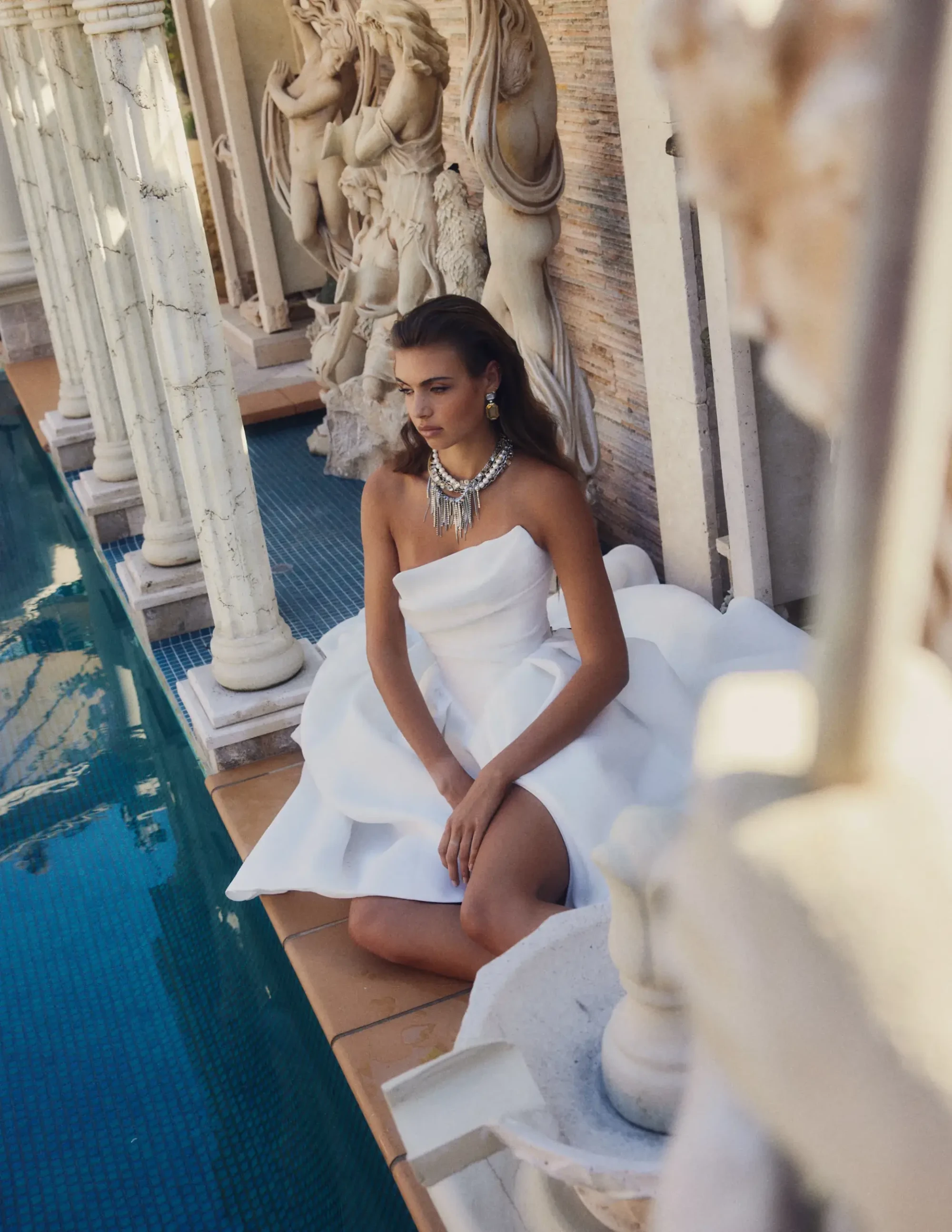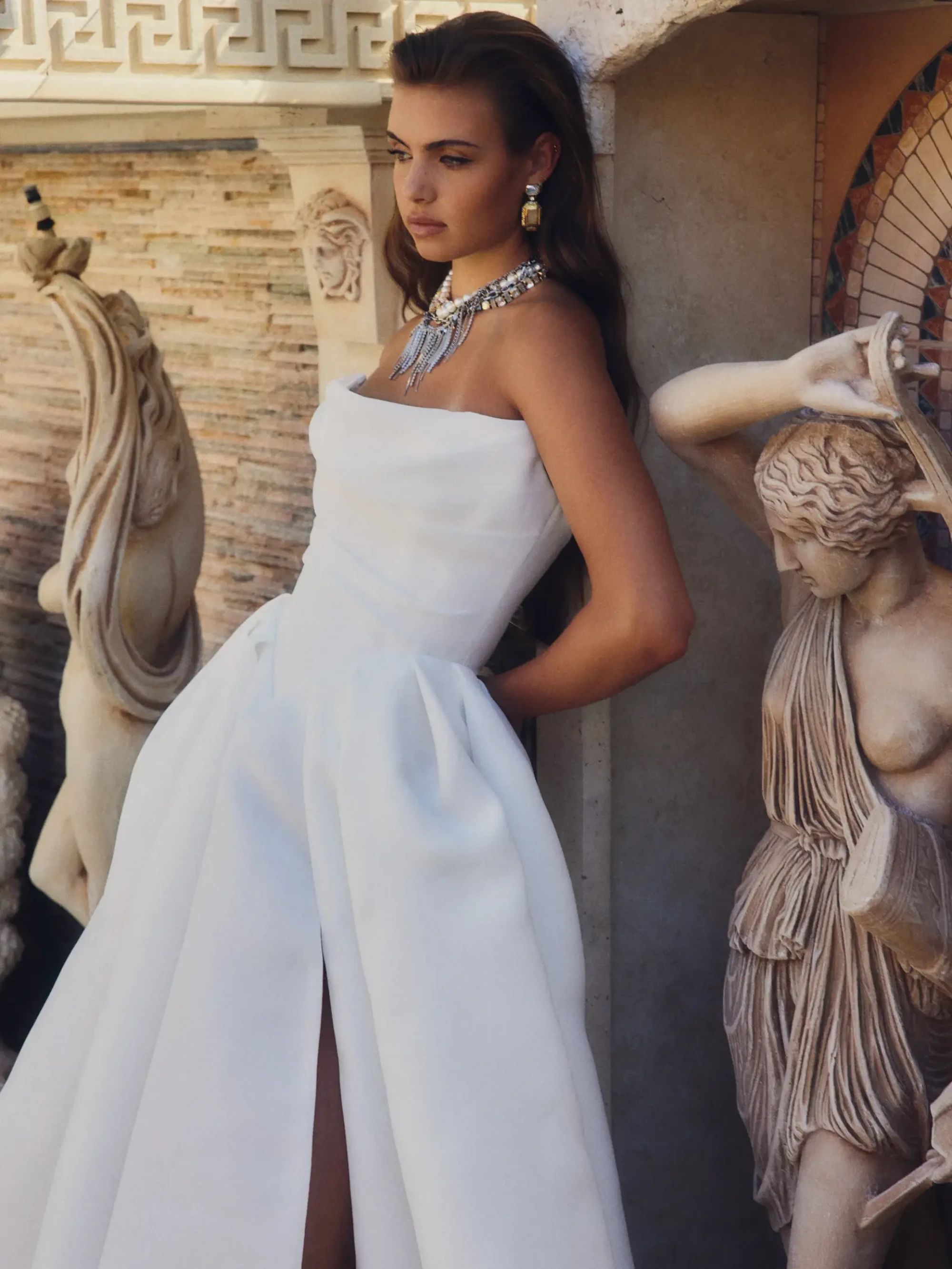 Embrace ethereal beauty with the Leah De Gloria Valkyrie gown, a breathtaking A-line silhouette designed to captivate. This exquisite dress features a sophisticated strapless neckline, highlighting the décolletage with timeless elegance. The flowing skirt, crafted from luxurious fabric, boasts a daring high slit that adds a touch of modern allure and allows for graceful movement. Perfect for the bride who desires a blend of classic romance and contemporary edge, the Valkyrie gown is a testament to refined craftsmanship and innovative design. Its intricate details and flattering cut ensure a memorable walk down the aisle, making every moment feel like a dream. Discover the unparalleled charm of the Valkyrie, a true masterpiece for your special day.