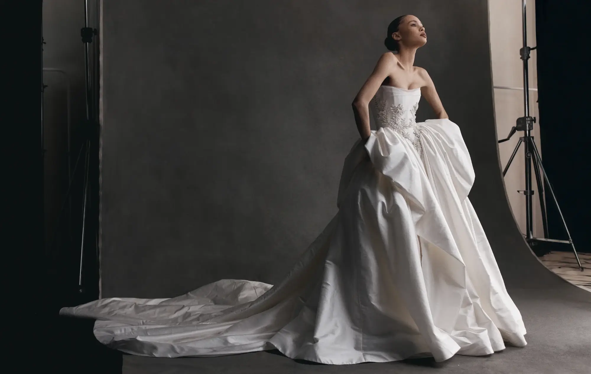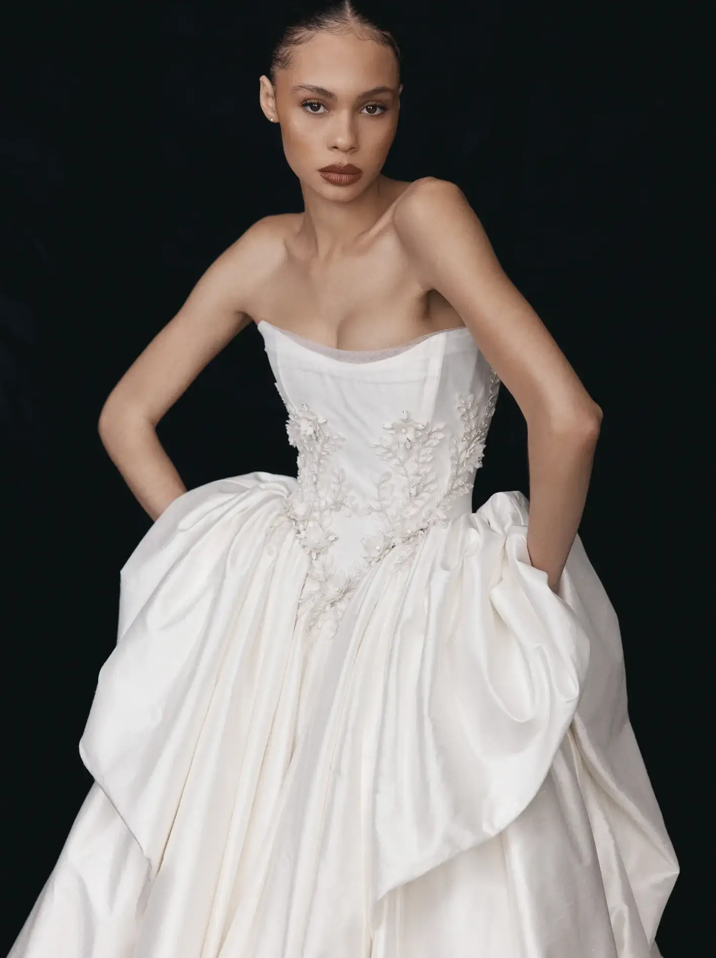 Embrace a striking blend of structure and romance with the Katya gown by Leah Da Gloria, a masterpiece designed for the modern bride. This exquisite strapless wedding dress features a beautifully sculpted bodice, meticulously adorned with delicate floral embroidery that gracefully cascades down, adding a touch of ethereal charm. The design culminates in a dramatic, voluminous skirt, characterized by its soft, architectural folds, creating a truly unforgettable ball gown silhouette. The Katya gown is a testament to modern couture, offering a timeless presence for the bride who desires both elegance and a fashion-forward statement on her special day. Its intricate detailing, luxurious volume, and sophisticated design ensure a breathtaking entrance and an ethereal aura, making every moment memorable. Perfect for a grand celebration, this gown embodies sophisticated charm and unparalleled craftsmanship, reflecting the unique vision and artistry of Leah Da Gloria.